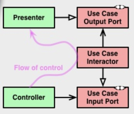 C'est ce qui est illustré par le diagramme en bas en droite de la figure. Le contrôleur dépend du cas d'utilisation, à travers l'interface Use Case Input Port. Cette interface est implémenté par Use Case Interactor qui implémente la fonctionnalité. L' Interactor a aussi besoin du presenter qui appartient à couche du dessus. On crée donc une interface dans la couche cas d'utilisation (Use Case Output Port), dont va dépendre l'i nteractor. L'interface Use Case Output Port sera implémentée par le p resenter dans la couche adapteurs d'interface (Interface adapters). Le presenter sera injecté plus tard dans l' interactor à l'instanciation de l' interactor.