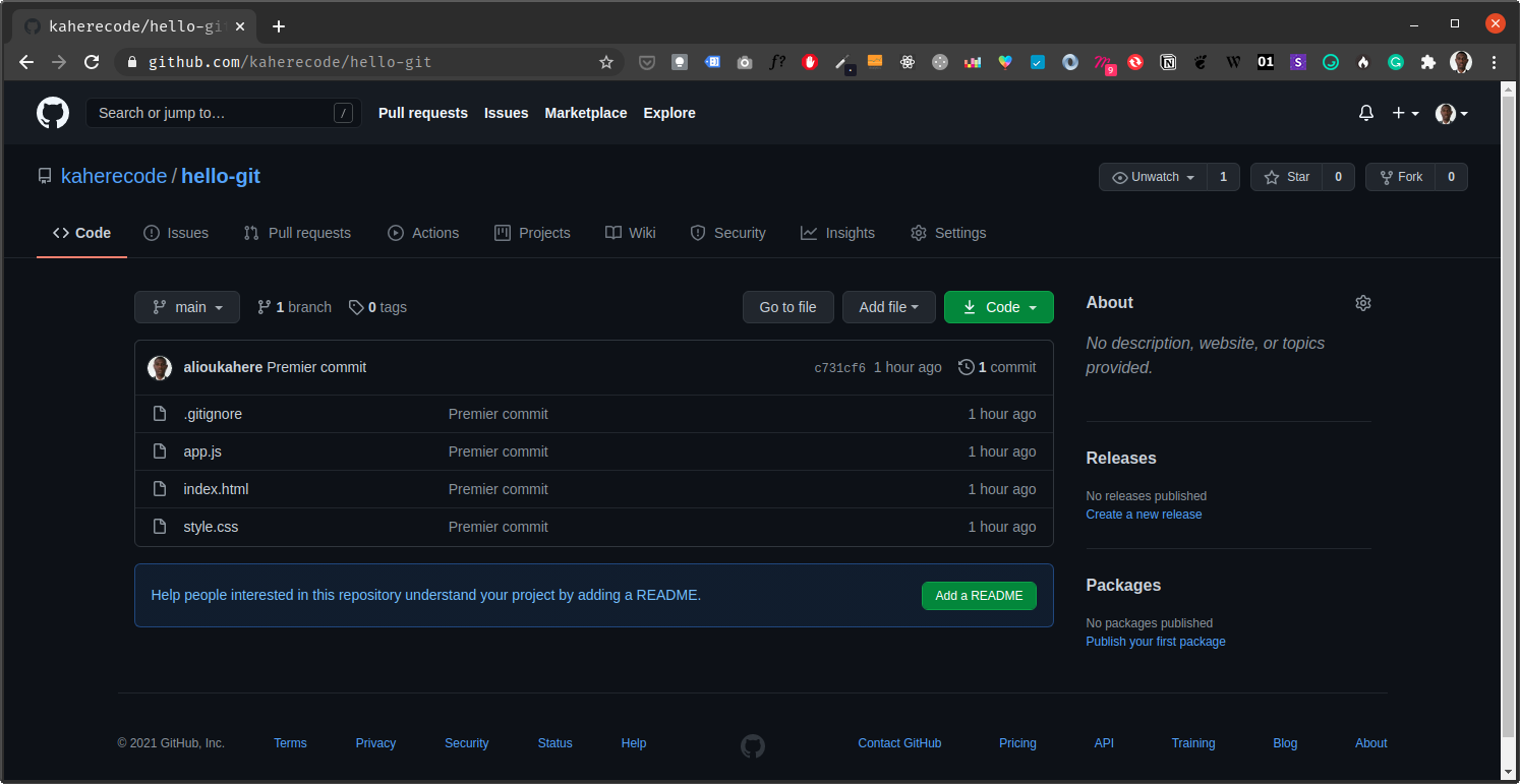 C'est bon tu peux être fier de toi et même pousser un cri de joie si tu veux, moi je suis content que tu sois arriver à ce point. A partir de maintenant, tu peux copier le lien sur la barre d'url, me l'envoyer par message et moi je pourrais accéder à ton code, le cloner sur mon ordinateur et ajouter ma part de bugs (ou t'aider à corriger ton problème).