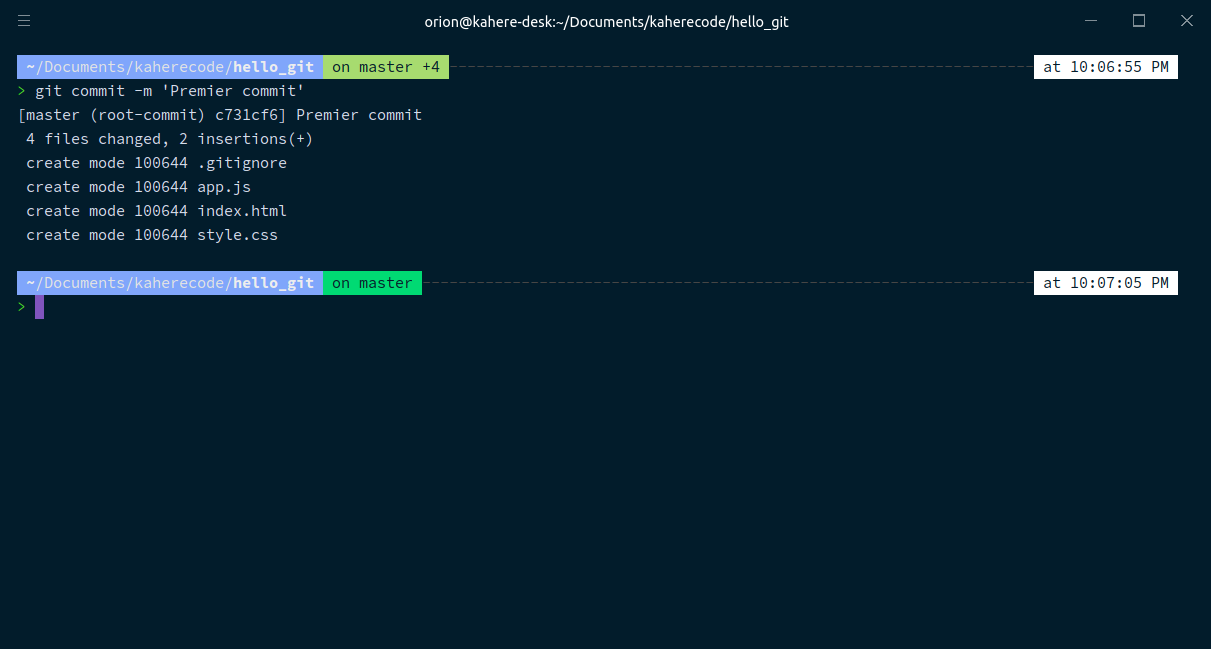 Tu as maintenant initialiser un dépôt Git, modifier les fichiers que tu souhaites et tu les a ajouter à Git avec git add. Il faut ensuite enregistrer les changements que tu as effectuer, je ne parle pas là de faire un Ctrl+S dans ton éditeur, mais d'enregistrer tes changements avec Git, et pour cela il faut faire un commit.