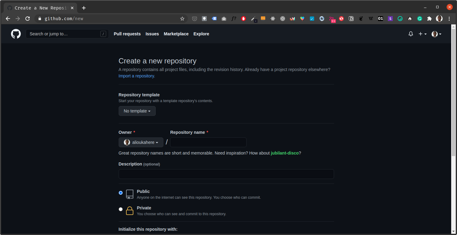 Clique ensuite sur le bouton avec l'icône du plus sur la barre de navigation avant ta photo de profil puis sur New repository. Tu arrives sur une page qui ressemble à ceci (avec un fond en blanc peut être):
